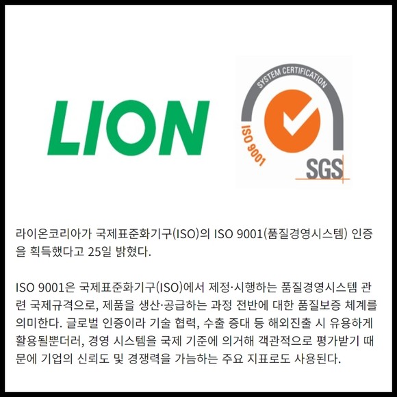 [프라임경제] 라이온코리아가 국제표준화기구(ISO)의 ISO 9001(품질경영시스템) 인증을 획득했다고 25일 밝혔다.