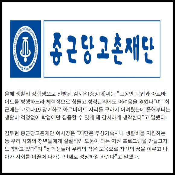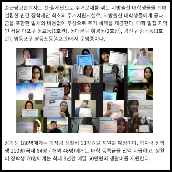 [카드] 종근당고촌재단, 국내·외 장학생에 장학금·무상기숙사 지원