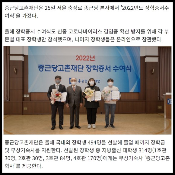 [프라임경제] 종근당고촌재단은 25일 서울 충정로 종근당 본사에서 '2022년도 장학증서수여식'을 가졌다.