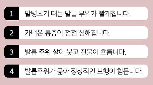 이호진 연세건우병원 족부전담팀 원장은 "엄지발가락은 우리 정상보행에 중추역할을 한다. 내향성발톱이 진행되면 염증과 피부부종, 통증이 생기는데, 환자들은 본능적으로 아프지 않은 쪽으로 걸으려고 한다"면서 "이 같은 특성 때문에 내향성발톱이 진행되면 발목염좌같은 족부외상 위험이 높아지며 무릎, 고관절, 척추에 불필요한 부하가 작용하면서 2차 합병증이 생기기도 한다"고 설명했습니다.