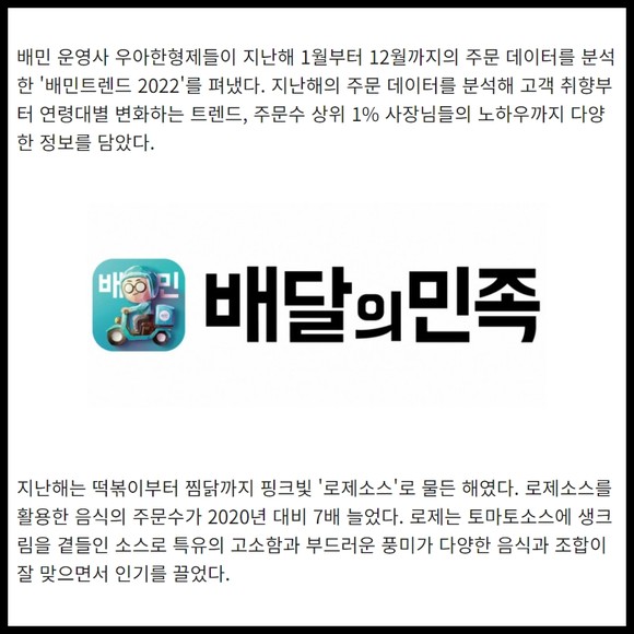 [프라임경제] 배민 운영사 우아한형제들이 지난해 1월부터 12월까지의 주문 데이터를 분석한 '배민트렌드 2022'를 펴냈다. 지난해의 주문 데이터를 분석해 고객 취향부터 연령대별 변화하는 트렌드, 주문수 상위 1% 사장님들의 노하우까지 다양한 정보를 담았다.