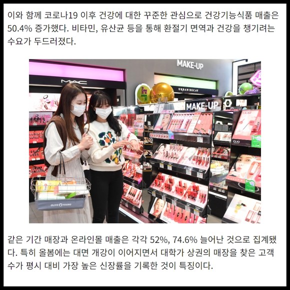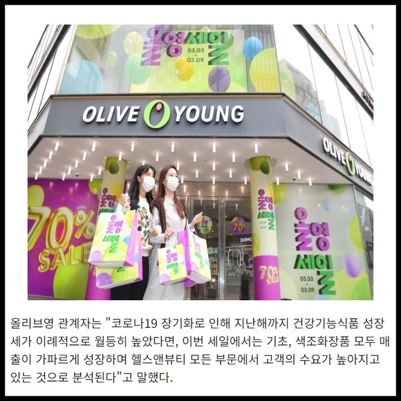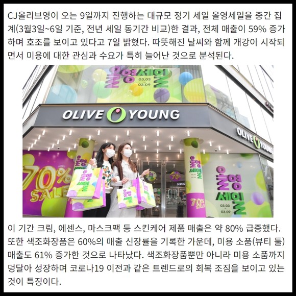 CJ올리브영이 오는 9일까지 진행하는 대규모 정기 세일 올영세일을 중간 집계(3월3일~6일 기준, 전년 세일 동기간 비교)한 결과, 전체 매출이 59% 증가하며 호조를 보이고 있다고 7일 밝혔다. 따뜻해진 날씨와 함께 개강이 시작되면서 미용에 대한 관심과 수요가 특히 늘어난 것으로 분석된다.
