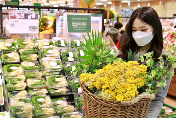롯데마트기 개나리를 닮은 노란빛이 특징인 국산 K-품종 'GAP 친환경 느타리버섯 개나리 에디션'을 3월 한달 간 한정 판매한다. © 롯데마트