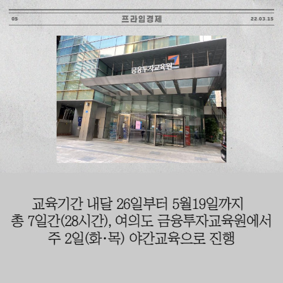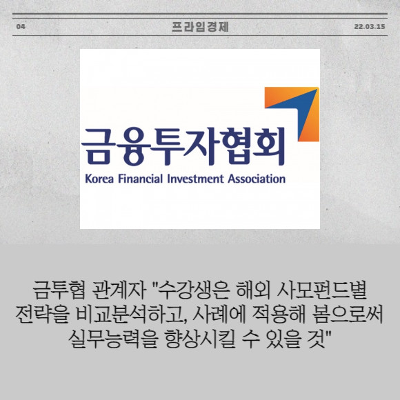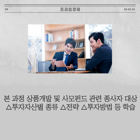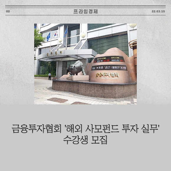 [프라임경제] 금융투자협회는 해외 사모펀드 관련 업무 실무자를 위한 '해외 사모펀드 투자 실무' 집합교육 수강생을 내달 4일까지 모집한다고 밝혔다.