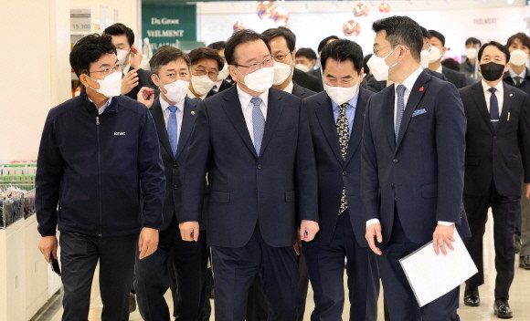 지난 16일 오전 경기도 용인 이마트 죽전점에서 열린 이마트 카페마을 1호점 개소식에 참석한 김부겸 국무총리. © 연합뉴스