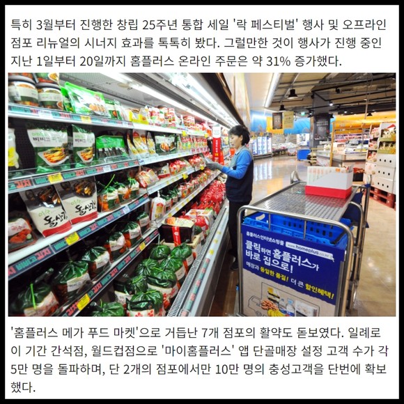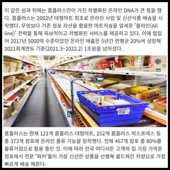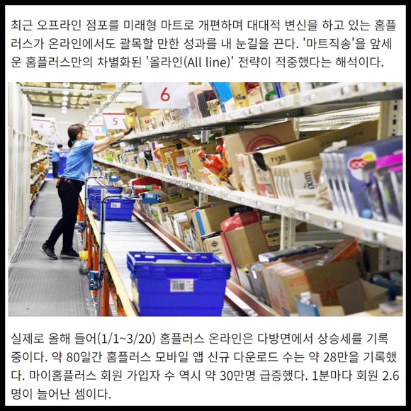 [프라임경제] 최근 오프라인 점포를 미래형 마트로 개편하며 대대적 변신을 하고 있는 홈플러스가 온라인에서도 괄목할 만한 성과를 내 눈길을 끈다. '마트직송'을 앞세운 홈플러스만의 차별화된 '올라인(All line)' 전략이 적중했다는 해석이다.