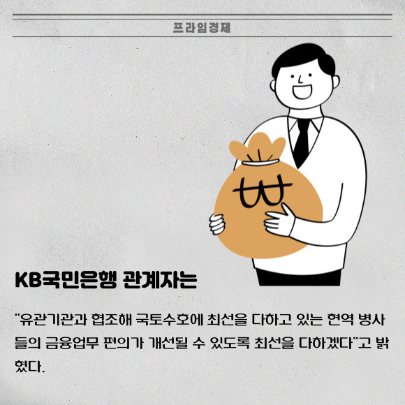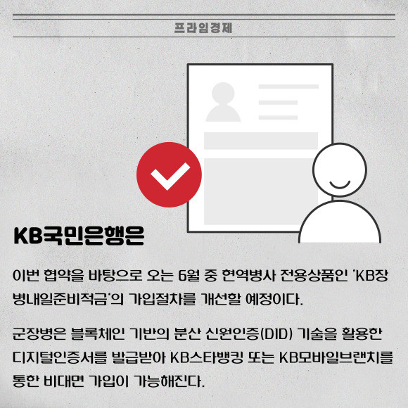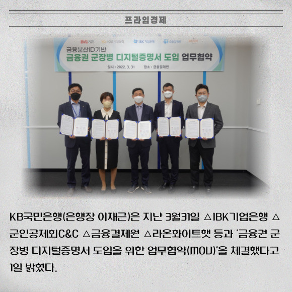 [프라임경제] KB국민은행(은행장 이재근)은 지난 3월31일 △IBK기업은행 △군인공제회C&C △금융결제원 △라온화이트햇 등과 '금융권 군장병 디지털증명서 도입을 위한 업무협약(MOU)'을 체결했다고 1일 밝혔다.