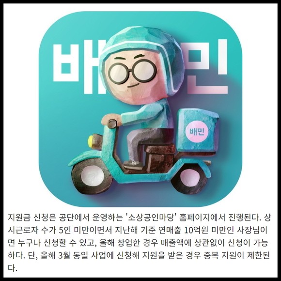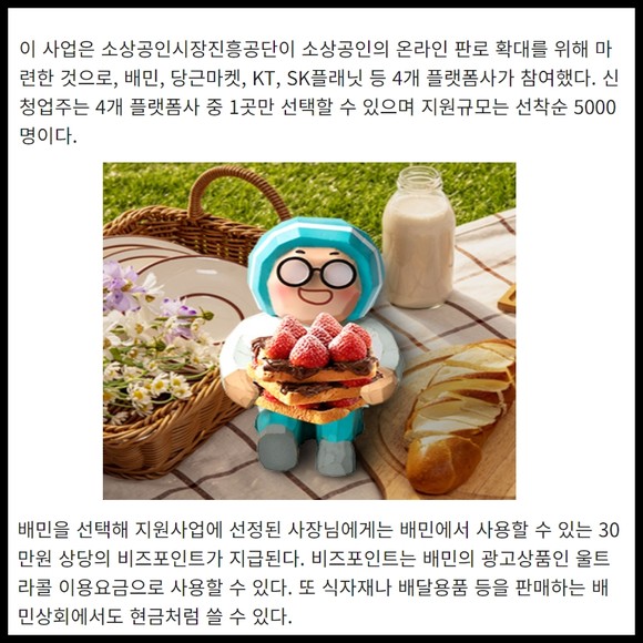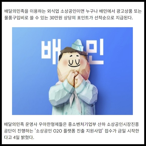 [프라임경제] 배달의민족을 이용하는 외식업 소상공인이면 누구나 배민에서 광고상품 또는 물품구입비로 쓸 수 있는 30만원 상당의 포인트가 선착순으로 지급된다.