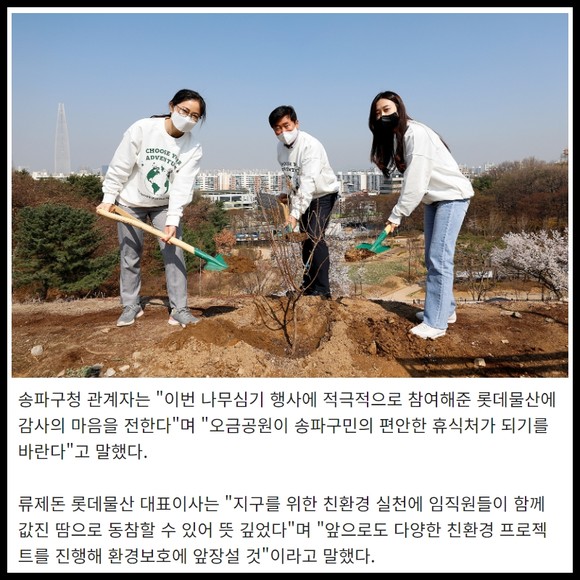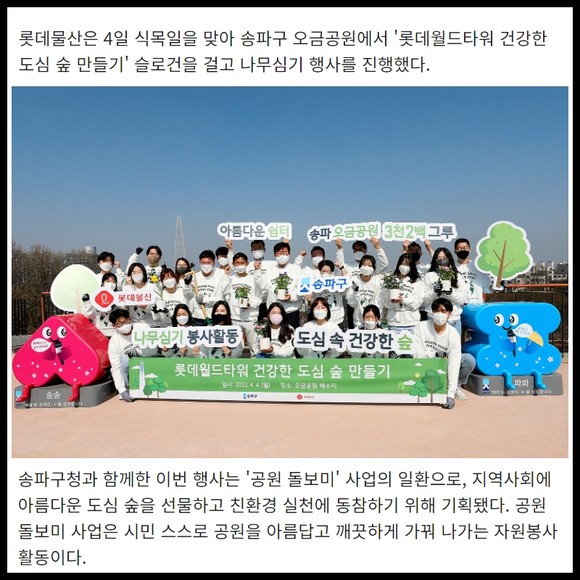 [프라임경제] 롯데물산은 4일 식목일을 맞아 송파구 오금공원에서 '롯데월드타워 건강한 도심 숲 만들기' 슬로건을 걸고 나무심기 행사를 진행했다.