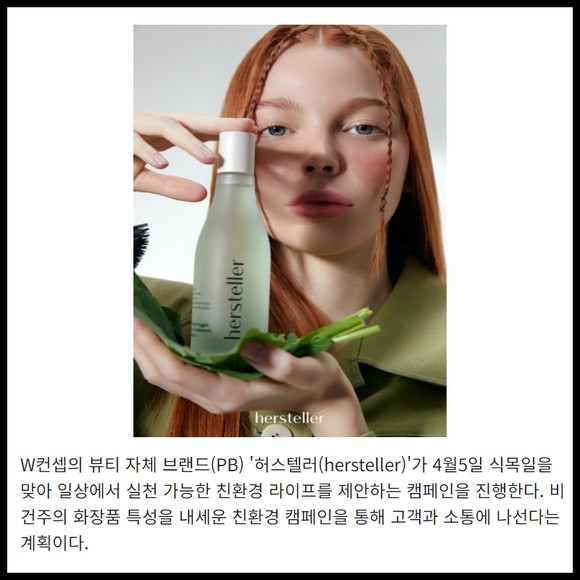 [프라임경제] W컨셉의 뷰티 자체 브랜드(PB) '허스텔러(hersteller)'가 4월5일 식목일을 맞아 일상에서 실천 가능한 친환경 라이프를 제안하는 캠페인을 진행한다. 비건주의 화장품 특성을 내세운 친환경 캠페인을 통해 고객과 소통에 나선다는 계획이다.