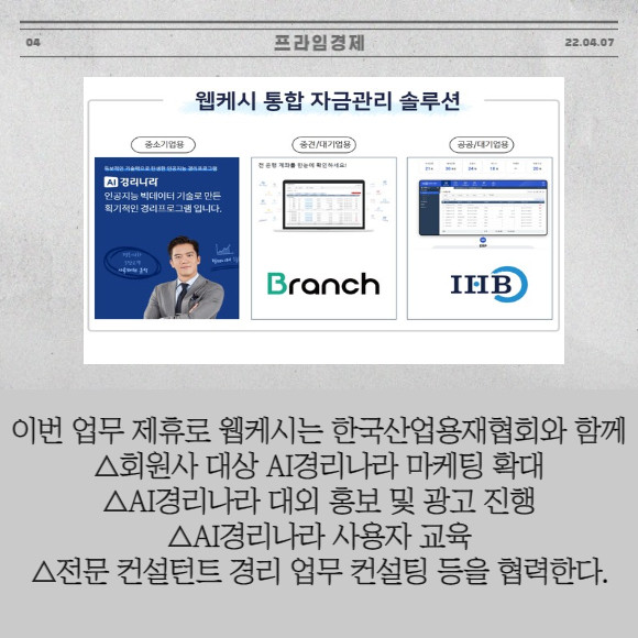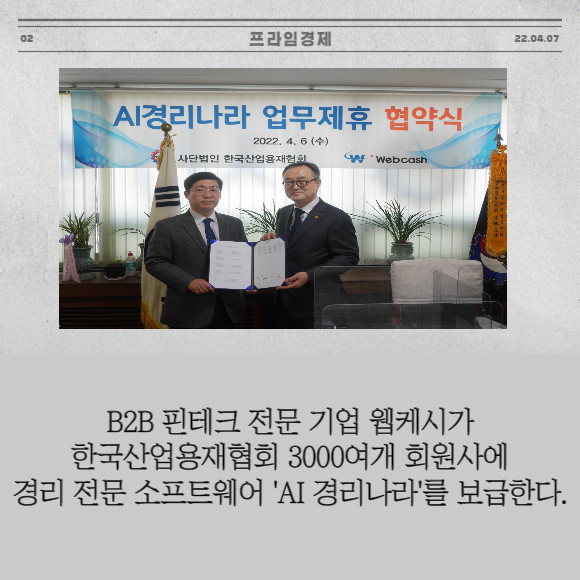 [프라임경제] 기업간거래(B2B) 핀테크 전문 기업 웹케시(053580)가 한국산업용재협회 3000여개 회원사에 경리 전문 소프트웨어 'AI 경리나라'를 보급한다.