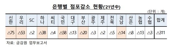 국내은행 점포 감소규모는 지방은행과 특수은행 대비 시중은행이 가장 많이 차지했다. 그중에서도 4대 시중은행 점포 수를 살펴보면 △신한은행 75개 △국민은행 58개 △우리은행 53개 △하나은행 38개 등 총 224개 점포가 감소하며 전체 감소량의 72%를 차지했다.