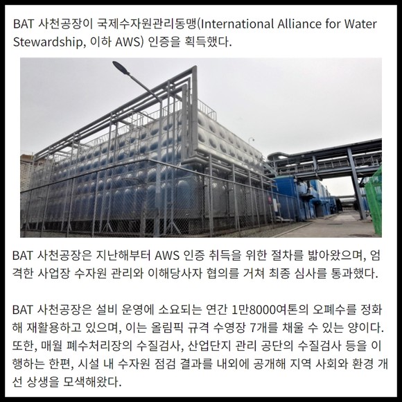 [카드] BAT 사천공장, 국제수자원관리동맹 인증 획득