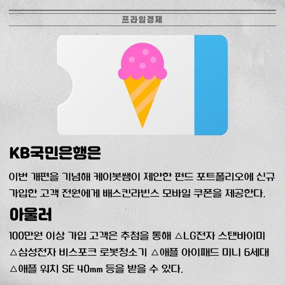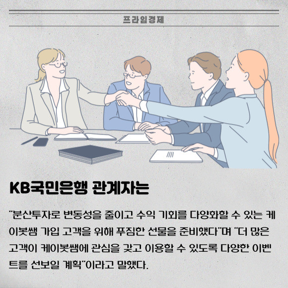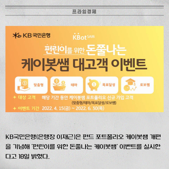 [프라임경제] KB국민은행(은행장 이재근)은 펀드 포트폴리오 케이봇쌤 개편을 기념해 '펀린이를 위한 돈쭐나는 케이봇쌤' 이벤트를 실시한다고 18일 밝혔다.