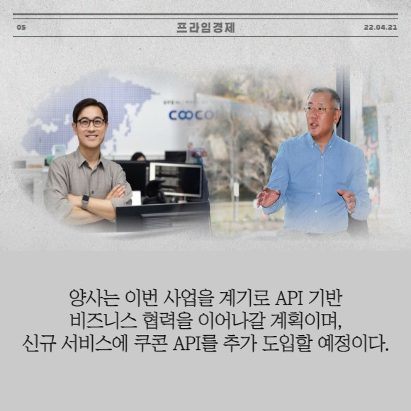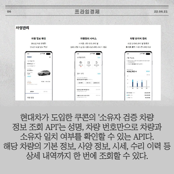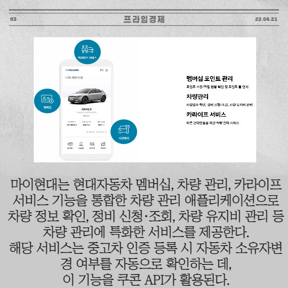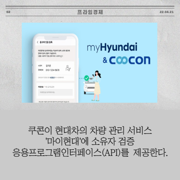 [프라임경제] 비즈니스 데이터 제공 전문 기업 쿠콘(294570)이 현대차(005380)의 차량 관리 서비스 '마이현대'에 소유자 검증 응용프로그램인터페이스(API)를 제공한다.
