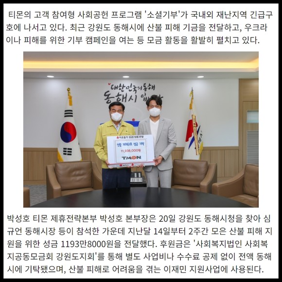 [프라임경제] 티몬의 고객 참여형 사회공헌 프로그램 '소셜기부'가 국내외 재난지역 긴급구호에 나서고 있다. 최근 강원도 동해시에 산불 피해 기금을 전달하고, 우크라이나 피해를 위한 기부 캠페인을 여는 등 모금 활동을 활발히 펼치고 있다.