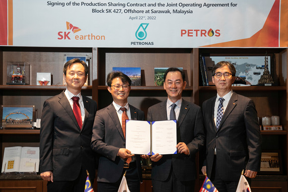 SK어스온은 지난 22일 말레이시아 국영 석유회사 페트로나스 및 말레이시아 사라왁(Sarawak) 주 석유개발회사 페트로스와 광구 생산물 분배계약을 체결했다. 앞서 SK어스온은 지난해 말레이시아 광구 입찰에 참여해 사라왁 지역 해상에 위치한 'SK 427' 광구를 낙찰 받는데 성공한 바 있다.