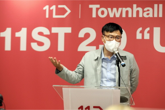지난 3일 오후, 11번가 서울스퀘어 사옥에서 진행된 타운홀 미팅에서 하형일 사장이 11번가의 균형 성장 전략에 대해 설명하고 있다. © 11번가