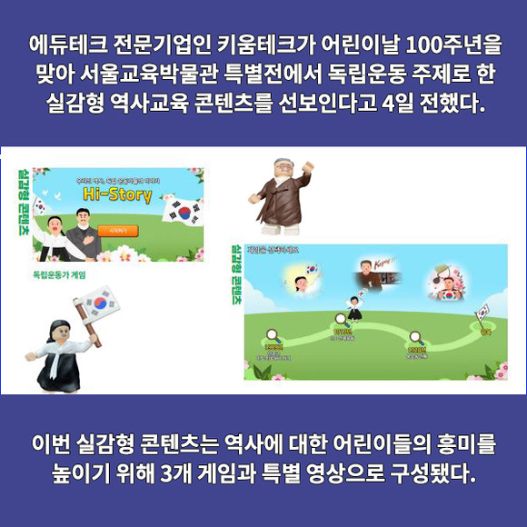 [프라임경제] 키움테크는 어린이날 100주년을 맞이해서 서울교육박물관 특별전에서 독립운동 주제로 한 실감형 역사교육 콘텐츠를 선보인다고 4일 전했다.
