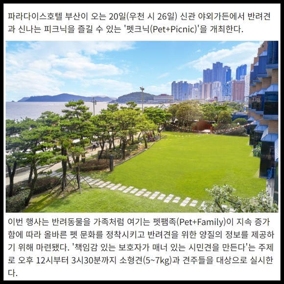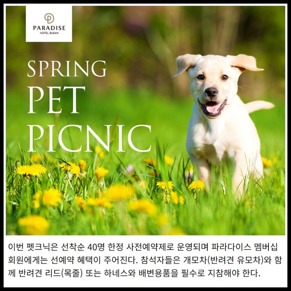 [프라임경제] 파라다이스호텔 부산이 오는 20일(우천 시 26일) 신관 야외가든에서 반려견과 신나는 피크닉을 즐길 수 있는 '펫크닉(Pet+Picnic)'을 개최한다.