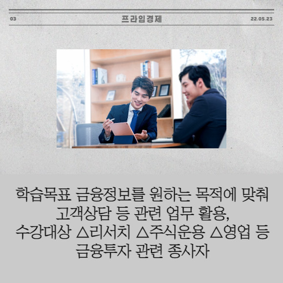 [프라임경제] 금융투자협회(는 금융정보 활용 역량 강화를 위한 '경제지표·금융정보 습득과 활용' 집합과정 교육생을 이달 23일부터 내달 10일까지 모집한다고 23일 밝혔다.