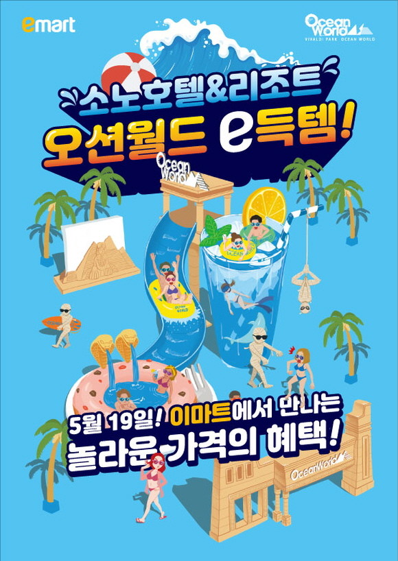 이마트는 5월19일부터 6월8일까지 21일간 이마트 고객만족센터에서 소노호텔앤리조트 주중 숙박권+워터파크 3인 이용권과 워터파크 3인 이용권을 판매한다.