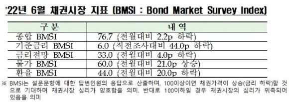이번 설문조사에서 집계된 6월 종합 채권시장지표(BMSI)는 76.7로 전월(78.9)보다 소폭 하락했다. 이는 지속되는 인플레이션 리스크로 인해 시장 심리가 한층 위축될 것이라 예상한 셈이다. BMSI가 100 이상일 경우 채권시장 심리가 양호함을 의미하며, 반대로 100 이하 시 채권시장 심리가 위축됐음을 의미한다.