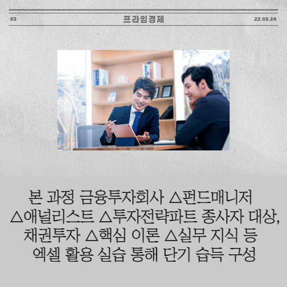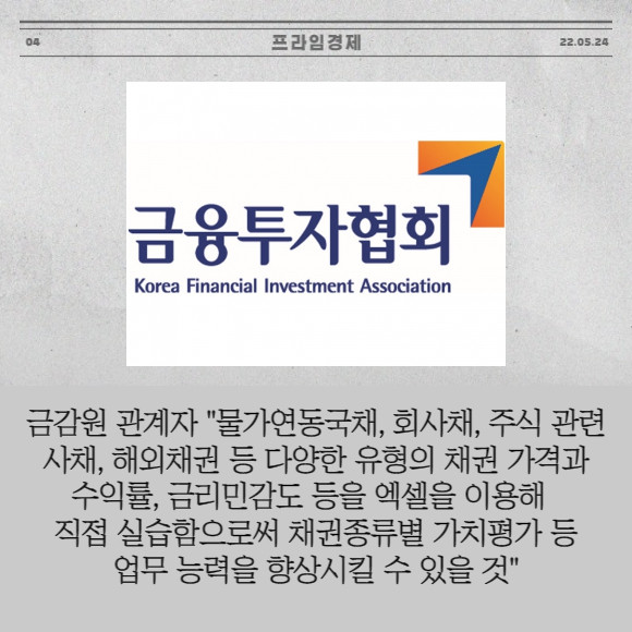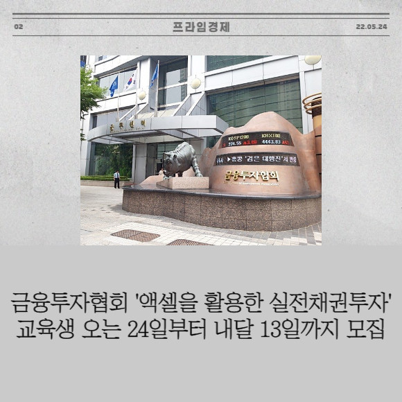[프라임경제] 금융투자협회는 24일 채권운용 관련 업무 종사자를 위한 '엑셀을 활용한 실전채권투자' 집합과정 교육생을 오는 24일부터 내달 13일까지 모집한다고 밝혔다.