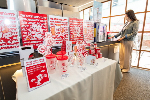 매머드커피 신사가로수본점 롯데월드 팝업스토어에서 모델들이 롯데월드와 컬래버한 신규 굿즈와 식음 메뉴를 선보이고 있다. © 롯데월드