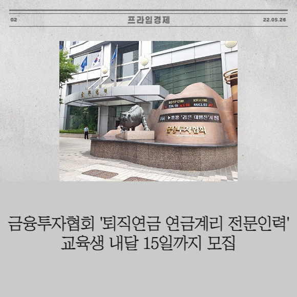 [프라임경제] 금융투자협회는 26일 연금계리 전문인력 양성을 위한 '퇴직연금 연금계리 전문인력' 집합교육 교육생을 내달 15일까지 모집한다고 밝혔다.