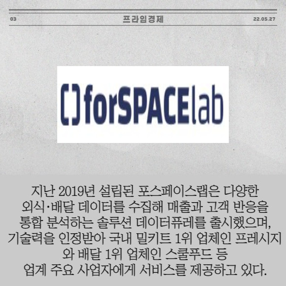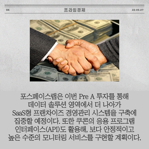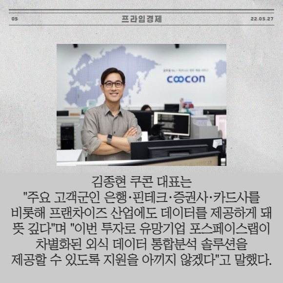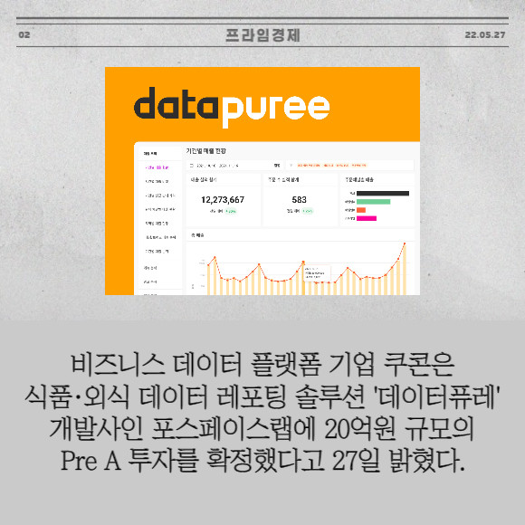 [프라임경제] 비즈니스 데이터 플랫폼 기업 쿠콘(294570)은 식품·외식 데이터 레포팅 솔루션 '데이터퓨레' 개발사인 포스페이스랩에 20억원 규모의 Pre A 투자를 확정했다고 27일 밝혔다.