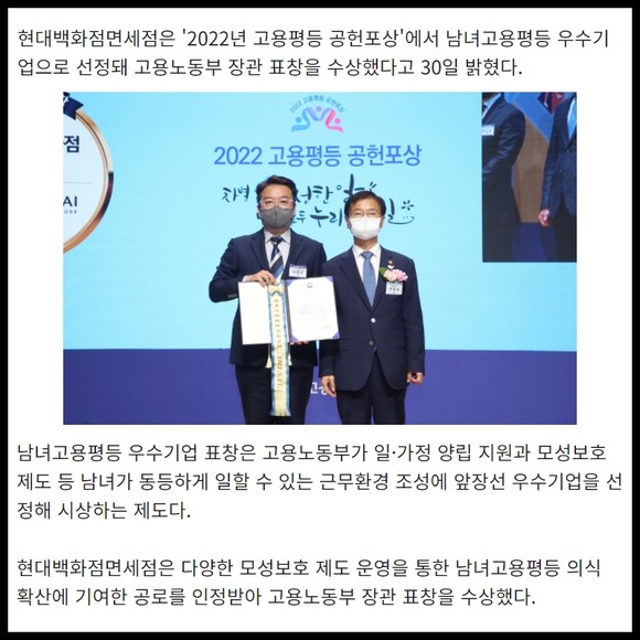 [프라임경제] 현대백화점면세점은 '2022년 고용평등 공헌포상'에서 남녀고용평등 우수기업으로 선정돼 고용노동부 장관 표창을 수상했다고 30일 밝혔다.