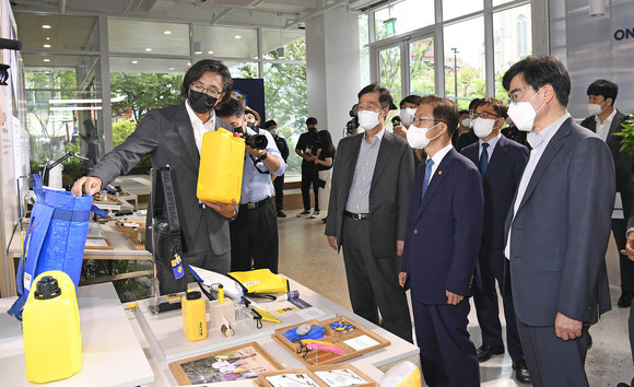 왼쪽 두 번째부터 권오규 현대차 정몽구 재단 이사장, 이정식 고용노동부 장관, 공영운 현대차그룹 사장이 박중열 제리백 대표로부터 전시제품에 대한 설명을 듣고 있는 모습. ⓒ 현대자동차그룹