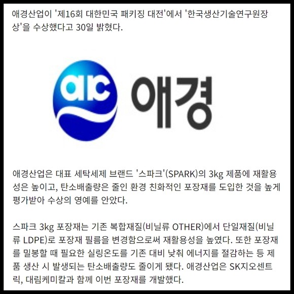 [프라임경제] 애경산업이 '제16회 대한민국 패키징 대전'에서 '한국생산기술연구원장상'을 수상했다고 30일 밝혔다.