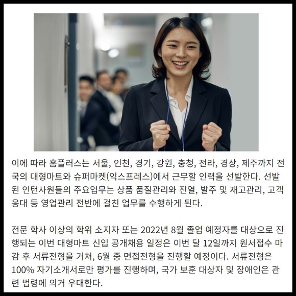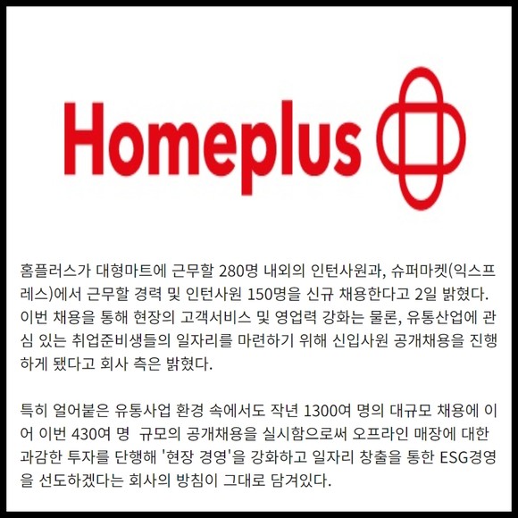 [프라임경제] 홈플러스가 대형마트에 근무할 280명 내외의 인턴사원과, 슈퍼마켓(익스프레스)에서 근무할 경력 및 인턴사원 150명을 신규 채용한다고 2일 밝혔다.