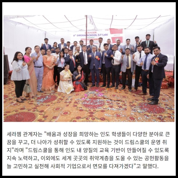 [프라임경제] 세라젬은 인도 가지아바드 지역에 8번째 '드림스쿨' 준공을 완료했다고 7일 밝혔다.