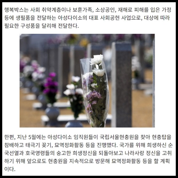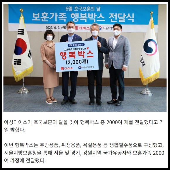 [프라임경제] 아성다이소가 호국보훈의 달을 맞아 행복박스 총 2000여 개를 전달했다고 7일 밝혔다.
