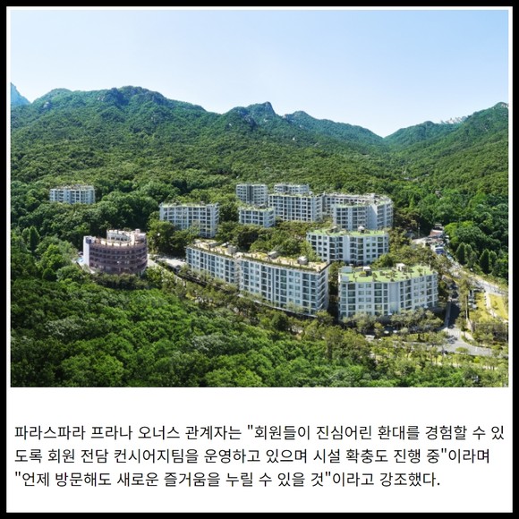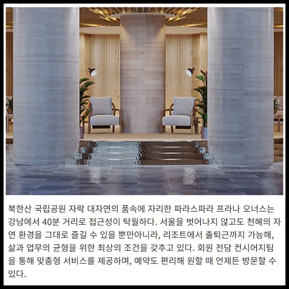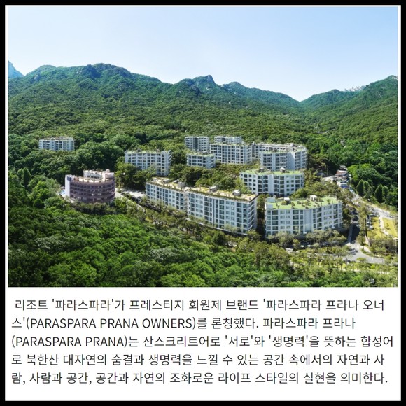 [프라임경제] 리조트 '파라스파라'가 프레스티지 회원제 브랜드 '파라스파라 프라나 오너스'(PARASPARA PRANA OWNERS)를 론칭했다. 파라스파라 프라나(PARASPARA PRANA)는 산스크리트어로 '서로'와 '생명력'을 뜻하는 합성어로 북한산 대자연의 숨결과 생명력을 느낄 수 있는 공간 속에서의 자연과 사람, 사람과 공간, 공간과 자연의 조화로운 라이프 스타일의 실현을 의미한다.
