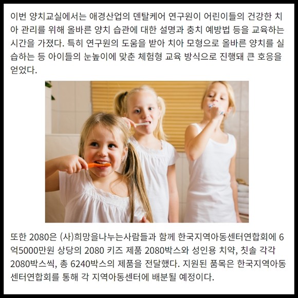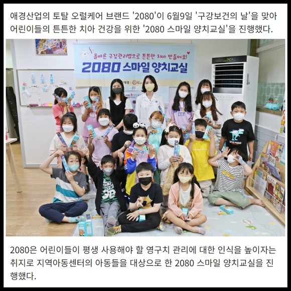 [프라임경제] 애경산업의 토탈 오럴케어 브랜드 '2080'이 6월9일 '구강보건의 날'을 맞아 어린이들의 튼튼한 치아 건강을 위한 '2080 스마일 양치교실'을 진행했다.