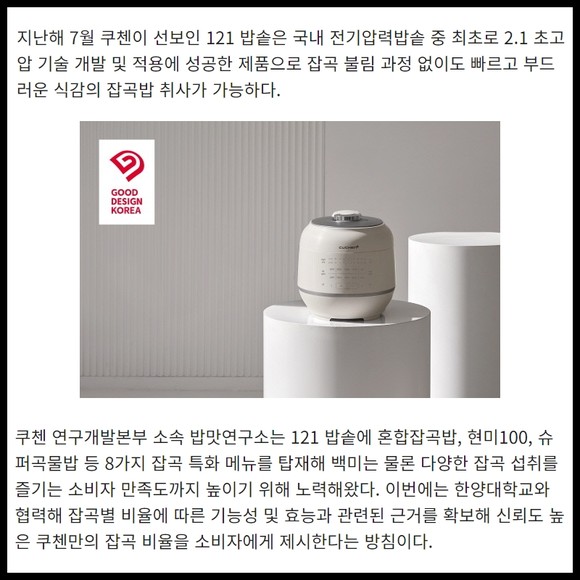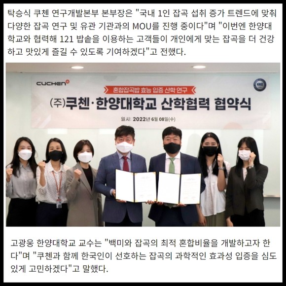 이번 산학협력을 통해 한양대학교 식품영양학과 영양유전체학 연구실은 쿠첸 '121 밥솥'을 활용해 쌀을 기반으로 서리태와 귀리 등 건강증진에 효능이 뛰어난 '잡곡 혼합 비율'을 찾고 '잡곡 효능' 입증 연구를 진행한다. 쿠첸 연구개발본부는 한양대학교의 황금비율 혼합잡곡 연구 결과를 토대로 뛰어난 밥맛과 건강 증진 효능을 갖춘 알고리즘 개발에 박차를 가할 예정이다.