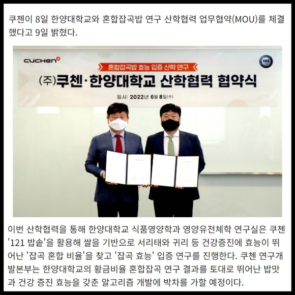 [프라임경제] 쿠첸이 8일 한양대학교와 혼합잡곡밥 연구 산학협력 업무협약(MOU)를 체결했다고 9일 밝혔다.