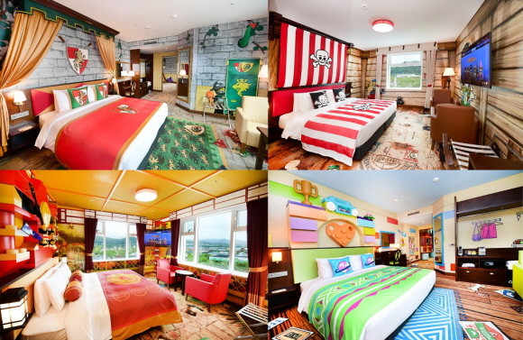 레고 테마의 호텔 객실. 좌측 상단부터 시계방향으로 킹덤, 파이러츠, 프렌즈, 닌자고. © 레고랜드