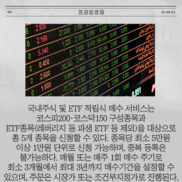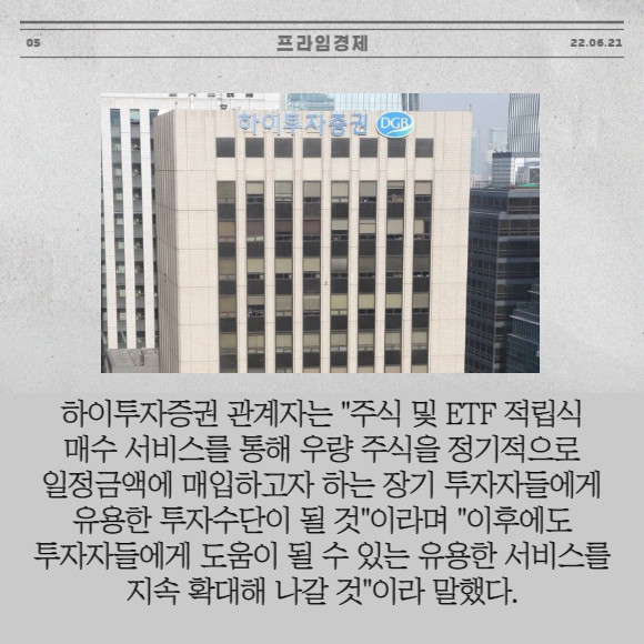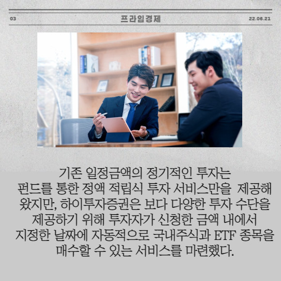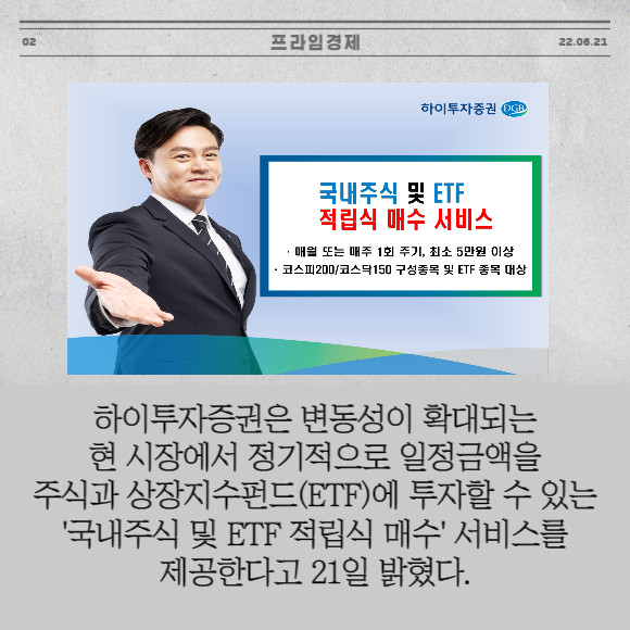 [프라임경제] 하이투자증권은 변동성이 확대되는 현 시장에서 정기적으로 일정금액을 주식과 상장지수펀드(ETF)에 투자할 수 있는 '국내주식 및 ETF 적립식 매수' 서비스를 제공한다고 21일 밝혔다.