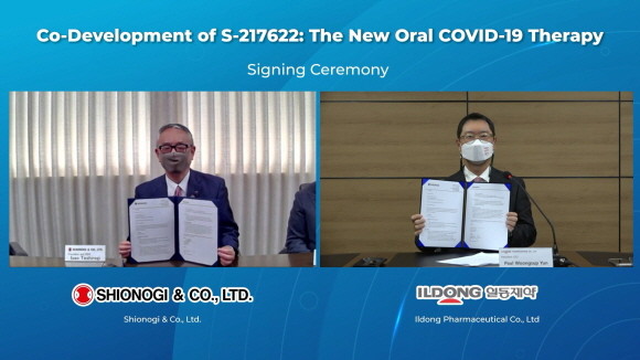 지난해 11월17일 일동제약, 시오노기제약 코로나19 치료제 공동개발 협약식. (왼쪽부터)테시로기 이사오 시오노기제약 대표, 윤웅섭 일동제약 대표. © 일동제약