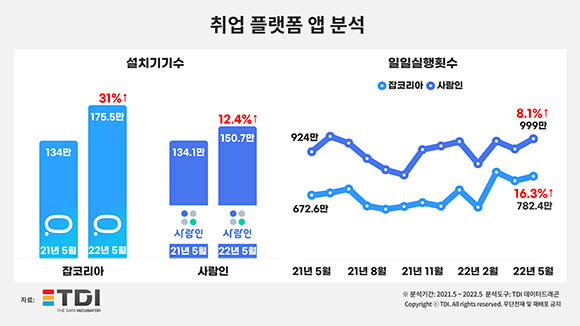 TDI 측이 발표한 자료에 따르면 2021년 5월 잡코리아는 134만건의 설치기기 수를 기록했고, 2022년 동월 175만5000건이다. 이어 사람인인 경우 2021년 5월 134만1000건에서 2022년 5월 150만7000건이다.