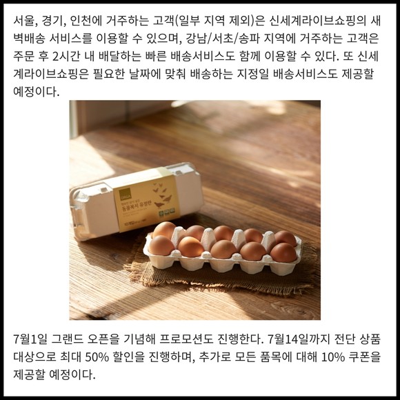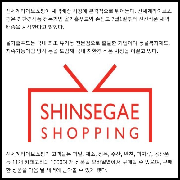 [프라임경제] 신세계라이브쇼핑이 새벽배송 시장에 본격적으로 뛰어든다. 신세계라이브쇼핑은 친환경식품 전문기업 올가홀푸드와 손잡고 7월1일부터 신선식품 새벽배송을 시작한다고 밝혔다.