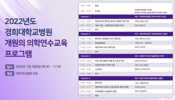 경희대학교병원은 지난 7월3일 개원의 의학연수교육을 온라인으로 진행했다고 밝혔다. 경희대학교병원 개원의 의학연수는 의학의 최신지견을 다양한 임상경험을 통해 개원의를 위한 맞춤식으로 공유해 참석자들로부터 좋은 평가를 받고 있다. 이번 연수교육은 경희대학교병원 호흡기내과 최혜숙 교수의 '폐기능 검사의 이해와 치료의 전략' 등 총 4개 세션 11개 강좌로 진행됐다.