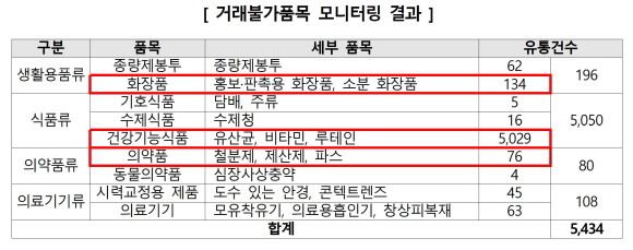 이어 '화장품법'상 판매가 금지된 홍보·판촉용 화장품 및 소분 화장품(134건), '약사법'상 온라인 판매가 불가한 철분제, 파스 등 의약품(76건) 등의 순으로 유통이 많은 것으로 조사됐다.