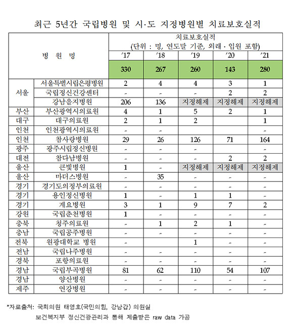 최근 5년간 국립병원 및 시·도 지정병원별 마약중독 치료보호실적 보고서. ⓒ 태영호 국민의힘 의원실