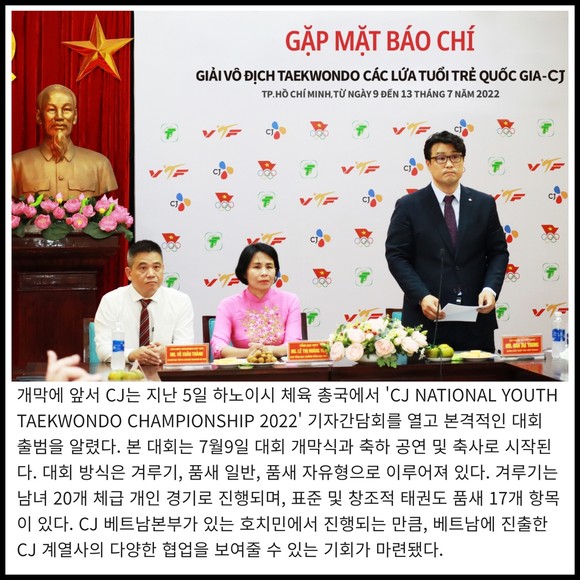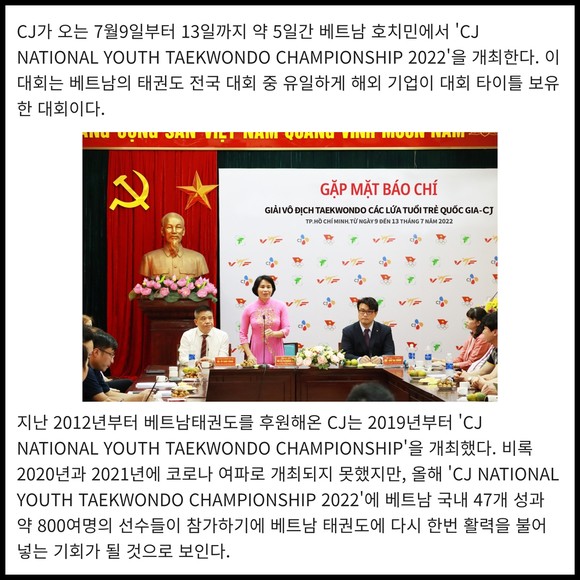 [프라임경제] CJ가 오는 7월9일부터 13일까지 약 5일간 베트남 호치민에서 'CJ NATIONAL YOUTH TAEKWONDO CHAMPIONSHIP 2022'을 개최한다. 이 대회는 베트남의 태권도 전국 대회 중 유일하게 해외 기업이 대회 타이틀 보유한 대회이다.